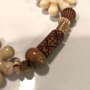 Home Studio 565 brand brings you this "Arie" bracelet. It's a neutral that isn't so neutral. It is a stretch slip on bracelet featuring mix of gold, brown & cream colored beads. The large stone is Jasper, which is a semi-precious stone. It is known as the "supreme nurterer" and is said to help achieve a state of calm & zen. It also helps protect your energy by absorbing all the negative engery. The sides of this stone are very different - one side is chocolate brown with cream spots while the other side is more cream with brown marbled throughout. The other beads are a lovely assortment of acrylic, faux-wood & crystals. Beautiful mixed media bracelet. New in package!