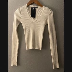 Fitted long sleeve sweater in ribbed cotton with a v-neck and raw hem.