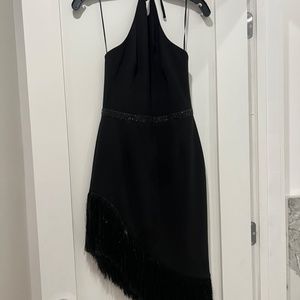 Halter Fringe Trim Angled Midi with Crystal Embellished Waist Detail