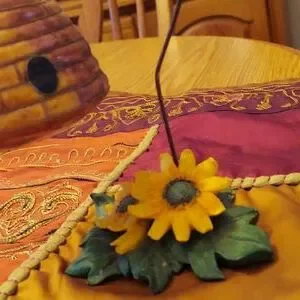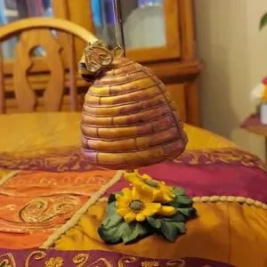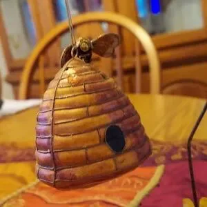 The entire piece is 8 inches high and 4 inches at its widest. The metal bee hive is painted gold and shiny. It has a black painted hole and a 1 3/4 inch wide bumblebee on top. Hive measures 2 3/4 inches high and 3 inches wide.