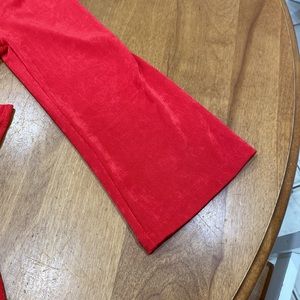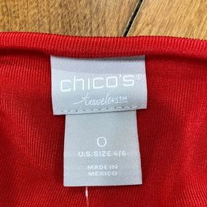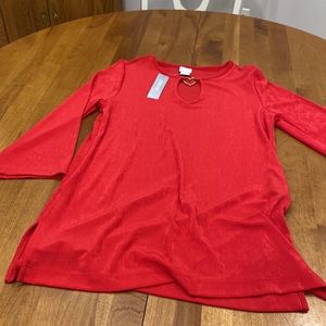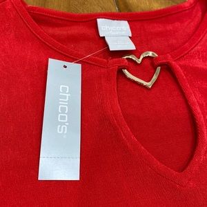 NWT. Chico’s, women’s size 0-(4/6), top. Stunning bright red top with keyhole neckline in front and gold heart accent. Perfect for Valentine’s Day! Stretch material with a slight sheen. Would make a great item for traveling- no ironing! Sleeves and bottom hem have slight flair. Slits on both sides at bottom hem for looser and more flattering fit. Measurement from pit to pit is approx. 17”. Length measurement from shoulder to hem is approx. 36” and put to hem is approx. 18-1/2”. New, with tag. Store in smoke-free home.