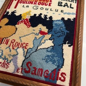 Vintage Framed Crewelwork Bridge Moulin Rouge La Goulue Original Needlepoint
