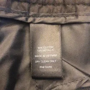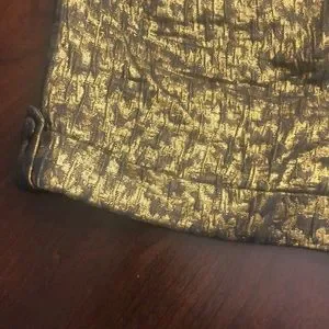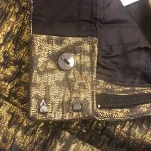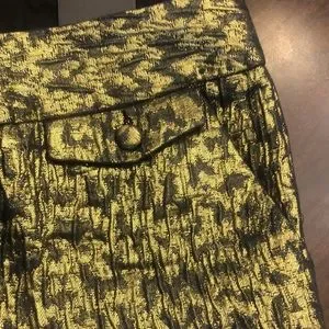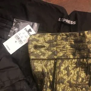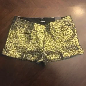 Gorgeous gold and black weaved dress shorts from Express featuring a low rise with a wide waist band, zip fly, a stitched cuff at the leg openings, and side pockets with additional tiny front pockets where the flap is. Brand new with tags, never been worn, and lying flat measures approximately 17 inches along the top of the waist band and 11 1/2 inches from the top of the waist to the bottom of the leg openings. These shorts are dressy and fun adding the perfect pizzazz to any occasion!