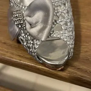 No longer fit me :(. Love these shoes. Would always receive compliments. Unique w the mesh design. Slight pull on the front of right heel and black scuff (both in photos) EUC no stones missing or damage to the back.
