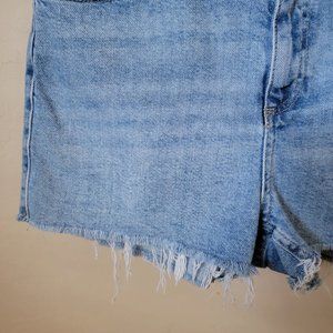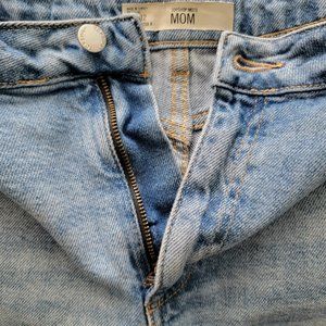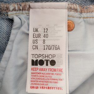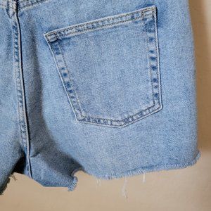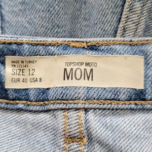 Topshop Moto Mom blue denim shorts, size 8. Blue denim. High rise. Stretch; stretchy. Cut off. Frayed hem. Lightly distressed. Zipper and button fly closure. Boho. Festival. Hippie.