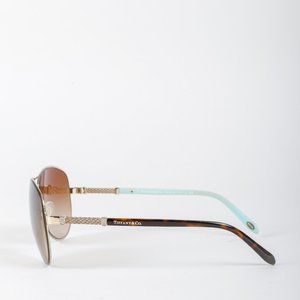 A stylish pair of full rim gold-tone aviator sunglasses from Tiffany & Co. featuring textured sides, gloss tortoise over Tiffany blue acetate arms branded with the Tiffany logo, brown gradient tinted lenses, and adjustable nose pads.