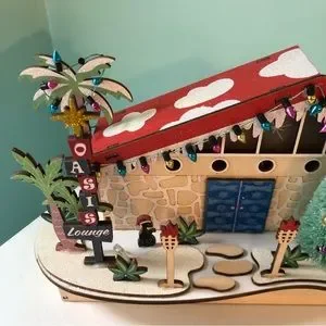 World Market / Cost Plus Midcentury ( MCM ) Christmas Village House w/ battery operated LED lights! Cute cats, palm trees, & tiki torches at the oasis lounge!