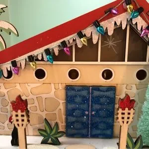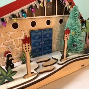 Bring a laugh to your Christmas village with our exclusive mid-century cocktail lounge decoration. Complete with a retro-kitsch sign, a palm tree decked out with Christmas lights and a martini on the rooftop, this delightful drinking hole is full of fun and festive details. This light-up decoration is intricately crafted of laser-cut wood and assembled by hand.