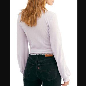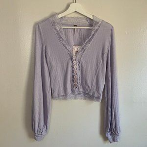 Femme slim-fitting cardigan featuring a button-up, textured design with puffed sleeves and delicate lace trim.