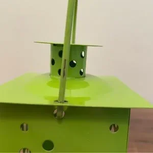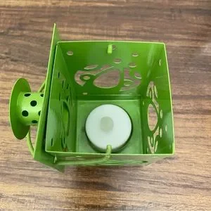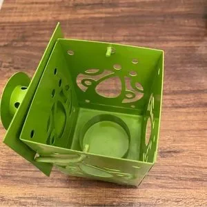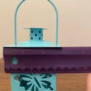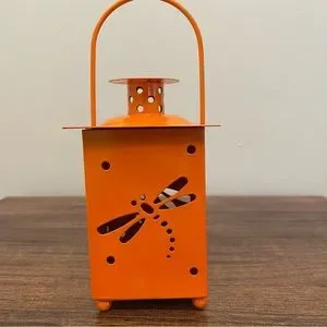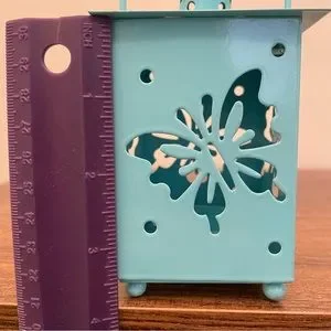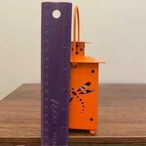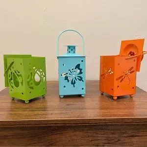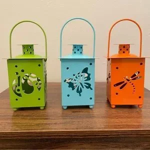 3 metal lanterns with a cutout of a dragonfly, lady bug, and butterfly. Spot inside for battery tea lights (not included). For decortication only - do not use real tea lights. Measurements are shown. Minor paint marks on the green and orange handles. Selling as a set but willing to sell as individuals if desired.