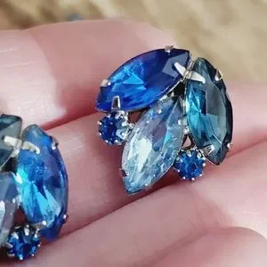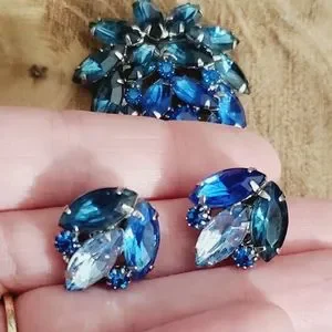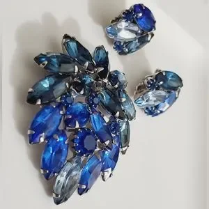 Absolutely stunning vintage estate find! This is a beautiful Blue ombre glass crystal stones navette and round all prong set. This is a nice weighted set not too heavy to comfortably wear but heavy enough to be really high quality! This is unsigned as MOST Juliana Deliza and elster D&G pieces were. They used to put paper Hang tags on them instead of hallmarks. This whole set is in amazing condition! This is set in silver setting, I'm not sure if it's silver plated or what type metal they used.