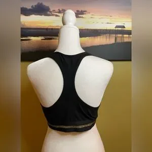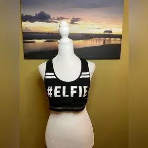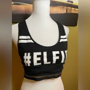 - Elfie white letters with gold sparkle trim… Sparkle gold striped band accents the sports bra