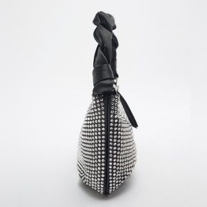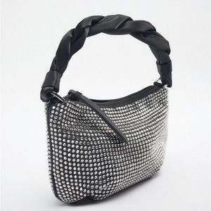 Shoulder bag with rhinestones. Braided handle. Lined interior. Zip closure.