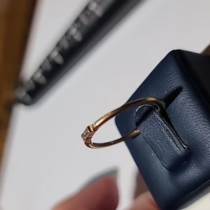 This jewelery is new with tags, never worn. 3 stone with baguette center design petite stackable 14KT yellow solid gold, 3 round natural diamonds GH- SI1, 0.03ctw , finger size 6.25, this ring may be sized up or down 1 size at your local jeweler. Ring is hallmarked 14KT. My price on this jewelry is firm. Jewelry is guaranteed as described above. sku#2695