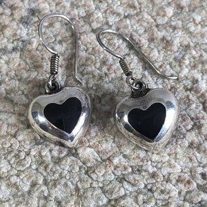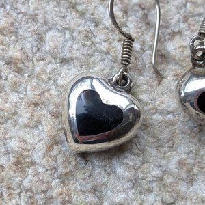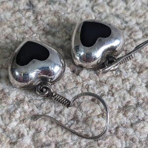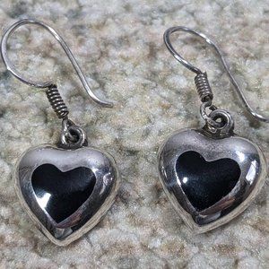 Super cute vintage Mexican Taxco Sterling Silver 925 heart charm earrings have black Onyx stone inlay!