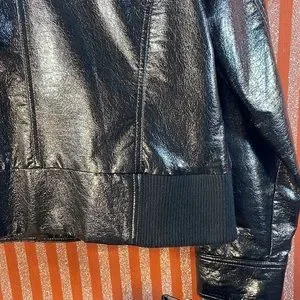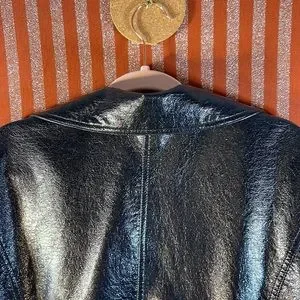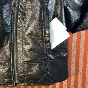 Black faux leather bomber style jacket. Buttery soft. Gun metal hardware with black silk lining. In like new excellent condition. Size XL.