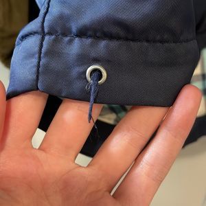 Elastic string around the waist is frayed/broken so the jacket hangs loose, but that’s comfortable anyways, and there seems to be torn fabric at the armpit but the first layer of fabric is still intact so it’s not a hole.