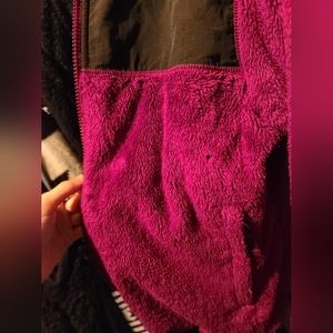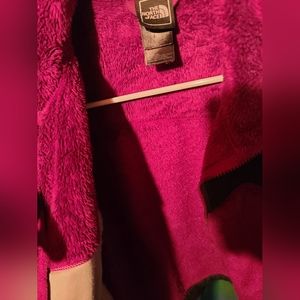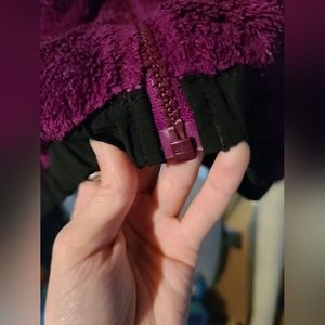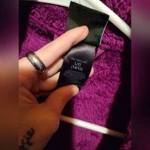 Girls size large (14/16) purple fleece north face. Bought it in person from a lady who used it 5 times, and I only wore it once. (*also fits women's/junior's XS as that's what size I am*) The only thing I have to mention is that it looks like there is a clear glue down on the side of the the zipper? (small and minimally noticeable as pictured) and there is a tiny hole near the armpit of one side (pictured) not very noticeable especially when worn.. if those flaws can be overlooked like they were for me then it is still a good jacket and has lots of life left.
