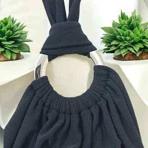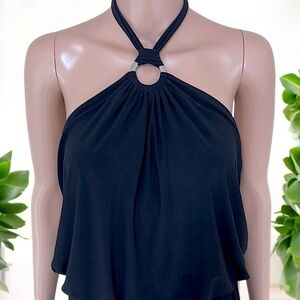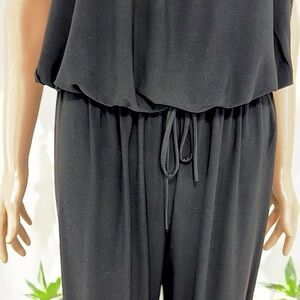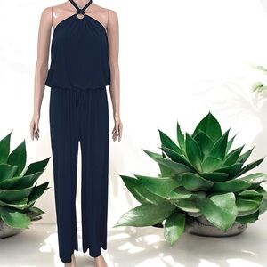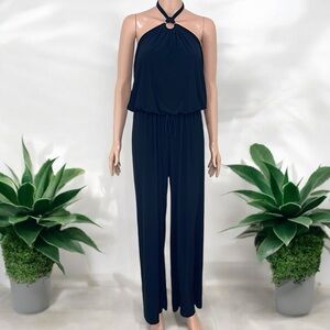 Black Tie Neck Halter Sleeveless Wide Leg Jumpsuit w/ Silver Ring Detail – Size L