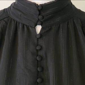 Sexy House of Harlow 1960 Black Metallic Dress with Blouson Bodice + Ruched Bottom... High Neck, Button Front with Long Sheer Bishop Sleeves...Gold Metallic Threads Throughout...Size 6...Excellent Pre-Owned Condition (worn once)...See Images