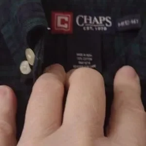 Navy forest green with double button sleeves and mother of pearl like buttons with button-down collar and chaps insignia in red