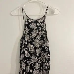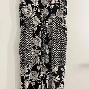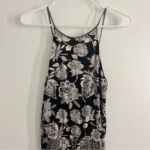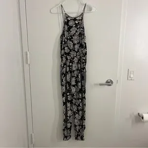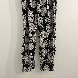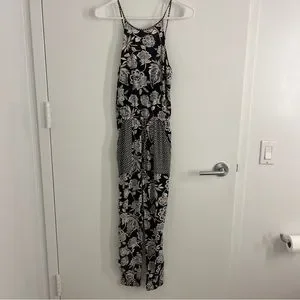 Gently used black and white floral jumpsuit. Front pockets. Elastic around hip with fake tie. Elastic around ankles as well. True to size. Excellent condition. No stains, tears or discoloration. Fast shipping!