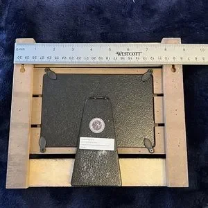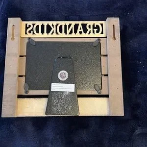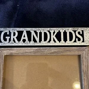 The frame is wood slats with a saying about grandkids. The frame can be hung on a wall or set on a desk or shelf.