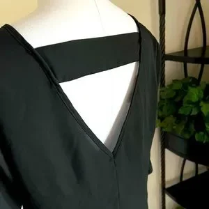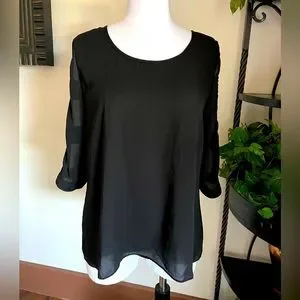 Pretty black sheer flowing blouse 3/4 cut out sleeve with cut out v-back. Sheer flowing blouse nice for work, evenings or casual dress. Previously loved in good condition. See all photos for visual condition. Size L