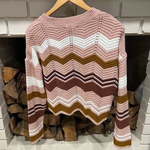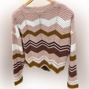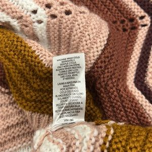 Multi Colored Cropped Knit Sweater with Scalloped Bottom- Juniors Size XL. Colors include pink, white, mustard, purple and dark pink. Gently used, great condition. No noticeable flaws. Smoke free home. 100% acrylic material.