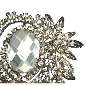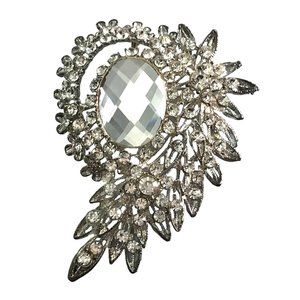 • Large (1 inch x 0.75 inch) faceted oval stone focal point surrounded by a spray of leaf shapes mounted with 4 mm round clear rhinestones.