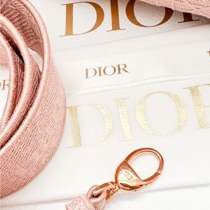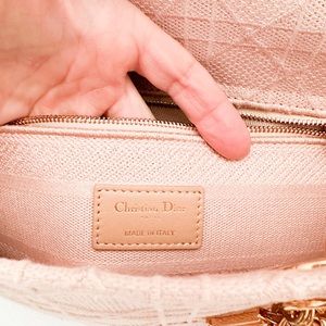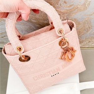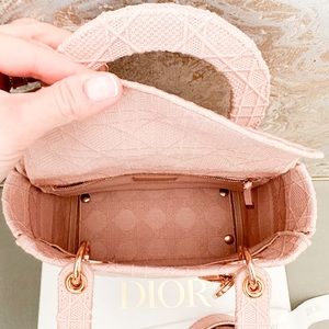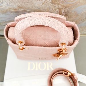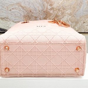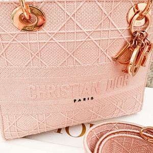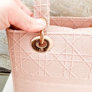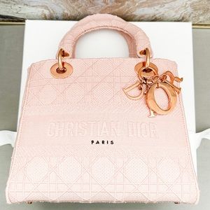 Beautiful authentic Christian Dior Canvas Cannage Medium Lady Dior in Pink. This stylish handbag tote is finely crafted of embroidered pink Cannage canvas with a 'Christian Dior' signature on the front and features fabric top handles and shoulder strap with gold hardware, including a Dior letters gold charm. The top opens to a Dior monogram fabric interior with a zipper pocket. Very good condition. Includes dust bag and shoulder strap only. Measures approx 9.25”x8”x4.5”.