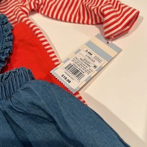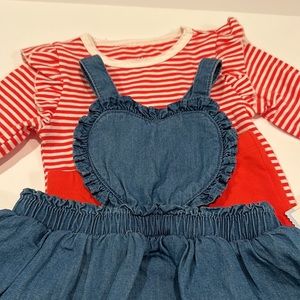 Infant girl 3-6 mo Valentine's Day set. Red & white strip set with red pants and adorable jean skirt heart shaped overalls.