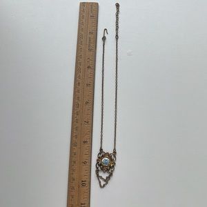 Victorian style necklace probably bronze with beautiful blue rose design. In my jewelry box 50 years- time to let go. No markings, perfect condition. Adjustable length. Unique.