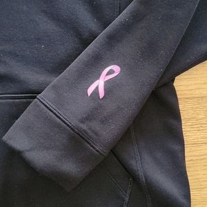 This is literally brand new, I just took the tags off. It's a limited edition breast cancer awareness female hoodie....black with hot pink lettering and signature cancer bow on the sleeve. It's the stretchy lycra type material (wind protectant) with not the traditional "sweatshirt" feel to it and more slimming shape with no drawstring. Fits small true to size but too short in the arms for me. That's the only difference I've seen between the regular small and the petite small....this exact one is no longer available in stores.