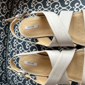 Size 40 eu, 10 us. Off white geox Respira. The mary karmen plus 1 wedge sandal is a classic sporty option with added cushioning. The sturdy mid height wedge offers a nice lift and the wide strap system will provide comfort and flexibility. The classic Geox rubber sole is based on an exclusive patent: the combination of the perforated sole and the resistant breathable and waterproof membrane allow for natural temperature regulation, thereby creating the perfect microclimate inside the shoe that keeps feet dry and comfortable for the whole day.