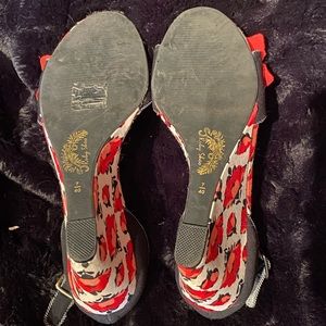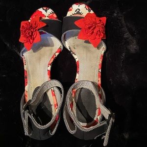 This beautiful pair of wedges by Ruby Shoo, a company from the UK, works for all seasons. Worn once, they are in excellent condition. The wedges are constructed of a soft but heavy black canvas, with a red flower detail on each toe strap. The wedge is covered in a beautiful red, black, and white floral print. The ankle strap is edged with tiny black and white polka dots. Very comfortable and stable 3 1/2” heel.