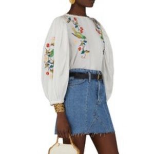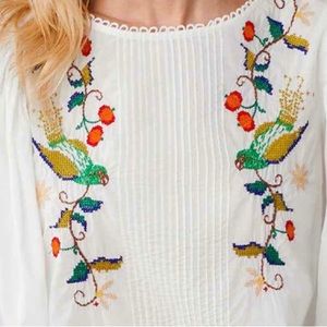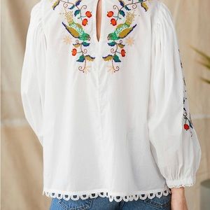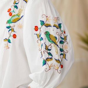 A Farm Rio embroidered statement piece. Romantic one-of-a-kind blouse with botanical and avian embroidery, pintucking, and voluminous, puffed sleeves. 100% Cotton. Machine wash. Size XS (0-2), S (4-6), M (8 to 10), L (12-4) and XL (16-18). Approximately 21" long. New with tags from Sundance. Originally $195, asking $119