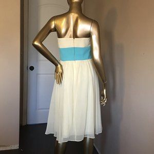 Beautiful flowing strapless dress in butter yellow with a set-in sash/bow. Back covered zipper, side and front seam stays. Colors named "Butter" and "Pool"
