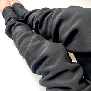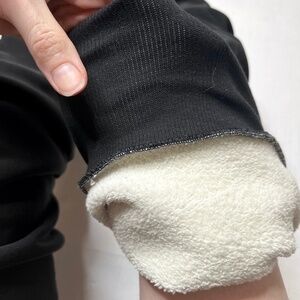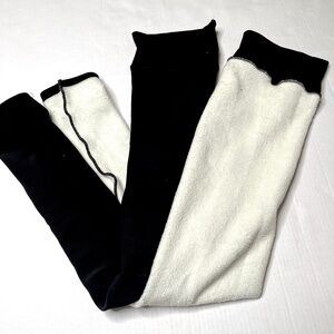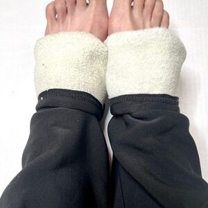 Soft and warm! Thick black shiny leg warmers with super soft white sherpa fleece lining. Thigh high length. Top ribbed bands. The bottom legs can also be folded up if you'd like a white sherpa cuff. Can also be worn slouched.