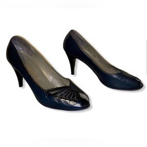 Bruno Magli Navy Blue Vintage Peep Toe Heels Made in Italy 8.5 AA Narrow