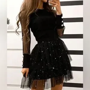 NWT! SZ M BLACK GLITTER SPARKLY SPARKLE MESH SLEEVE TUTU DRESS