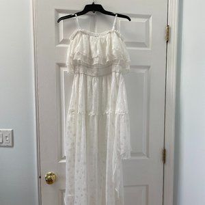 White Dress, never worn, tags still on! Size small. Worn as an off the shoulder dress (straps shown in pictures are just for hanging)