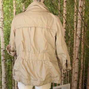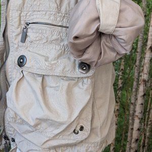 Lots of pockets for your survival gear. Lots of snaps. Adjustable sleeves. Big collar. Cinched waist. Beige, neutral, military, safari, apocalypse coat. Sturdy metal zippers. Fully lined. Great for killing zombies, or just looking good.