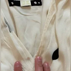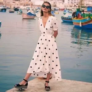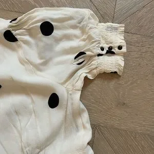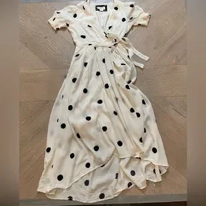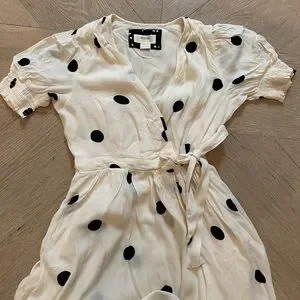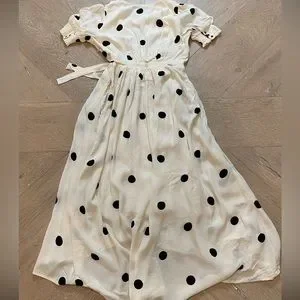 Black and white polka dot dress. Scrunched / button up sleeves and a tie at waist. Beautiful spring / summer dress! Size 2P Excellent condition, with the exception of microscopic stain pictured in last photo.