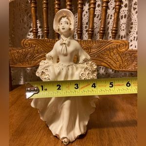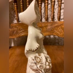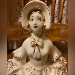 Get swept up in the charm of this lovely lady figurine with her creamy white coloring and gold accented gilded outlines!