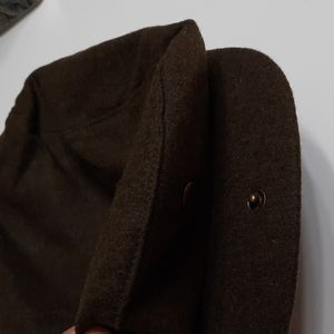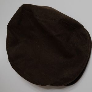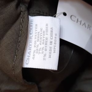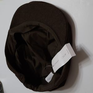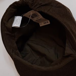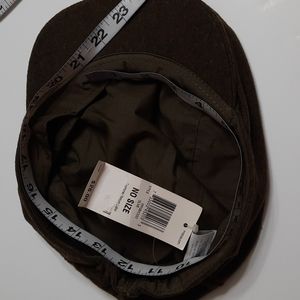 NWT CHARTER CLUB OLIVE FLAT CAP that snaps in front and gathers at back. Inside band around cap edge.. Lined. Wool blend material on outside. FLAW: tiny spots on top left.