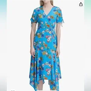 Calvin Klein v-neckline wrap dress with ruffle front.