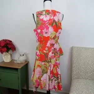 Size 8. Lend modern flair to your dressed-up look in this A-line dress from N Natori, designed with a chic asymmetrical ruffle that cascades at the skirt. Bright red/orange color with pink and green floral print. Features a round neckline, a hidden back zipper with hook-and-eye closure, a cascading ruffle at front and an asymmetrical hem. Fully lined. Fabric is 100% polyester. Made in Philippines.