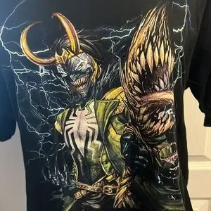 Black shirt sleeved t shirt. Loki and Venom pictured on the front