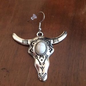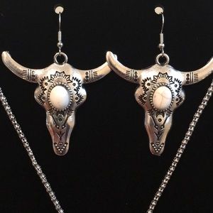 Accent your western outfit with this silver bulls head necklace & earring set with western engraved designs and ivory stone in the middle. 1.75” tall x 2” widependant on an 18” chain with extension. Earrings are on fish hooks